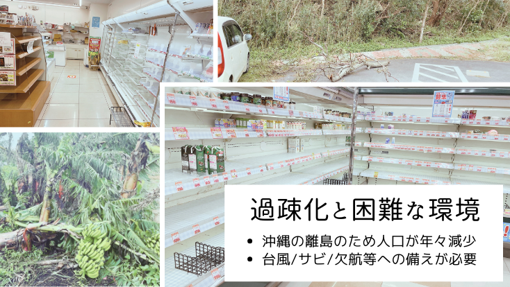 そのような豊かな環境を持つ久米島ですが、離島であること、また那覇に近いという地理的要因もあり、「人口減少・過疎化」で苦しんでいる状態です。特に生産年齢人口の減少が激しく、様々な面で社会資源が足りておりません