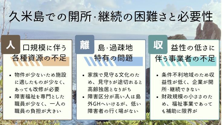 - 島内における利用者の方の障害区分の低さ・離島という地理的条件による収益性の低さ