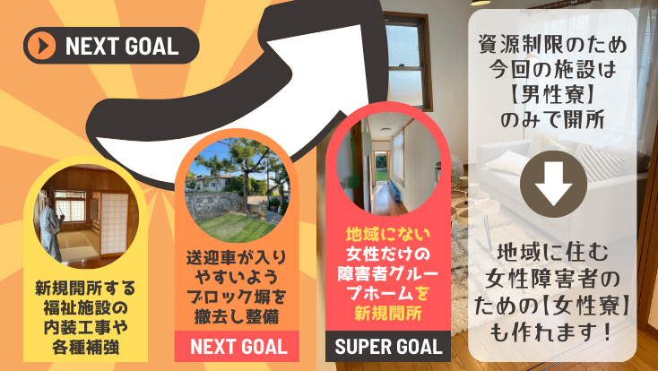 プロジェクトが成立いたしましたら、新しく開所する施設のブロック塀の撤去など、施設の利便性の向上・運営基盤の強化に使用いたします。また、ネクストゴールを達成いたしましたら、今回の新規開所でも作ることができなかった女性寮を開所いたします。 障害者グループホームは共同生活(シェアハウスのようなイメージです)という性質上、男性または女性のみでの生活が望ましいため、今回の開所は男性寮のみです。ですが、地域には当然女性の障害者の方も多くいらっしゃいます。この方々のためにも、女性寮を早めに開所できればと思っております。また、定員が増加することで施設運営としても安定し、長くより良いサービスを提供していくことが可能となります。 ※ 今回のクラウドファンディングにおけるリターンには、寄付型のものだけでなく、より皆様からのご寄付をいただけるよう「久米島特産物品による返礼品型」のものも含まれております。そのため、READYFOR様の手数料、および返礼品をご用意いただく島内のご協力者様方への分を引き、残りの全額を障害者グループホームの運営資金に使用させていただきます。