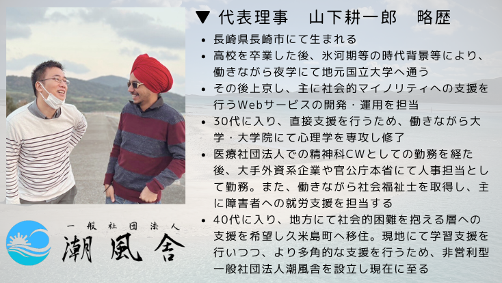 私共「一般社団法人潮風舎(ちょうふうしゃ)」は、社会福祉士が代表を務める非営利性が徹底された定款をもつ非営利型一般社団法人です。関係する皆様全体がより満足した生活を送ることができるようになればと活動しております(現在、地域にて働く外国人等への無料日本語教室などを行っております)