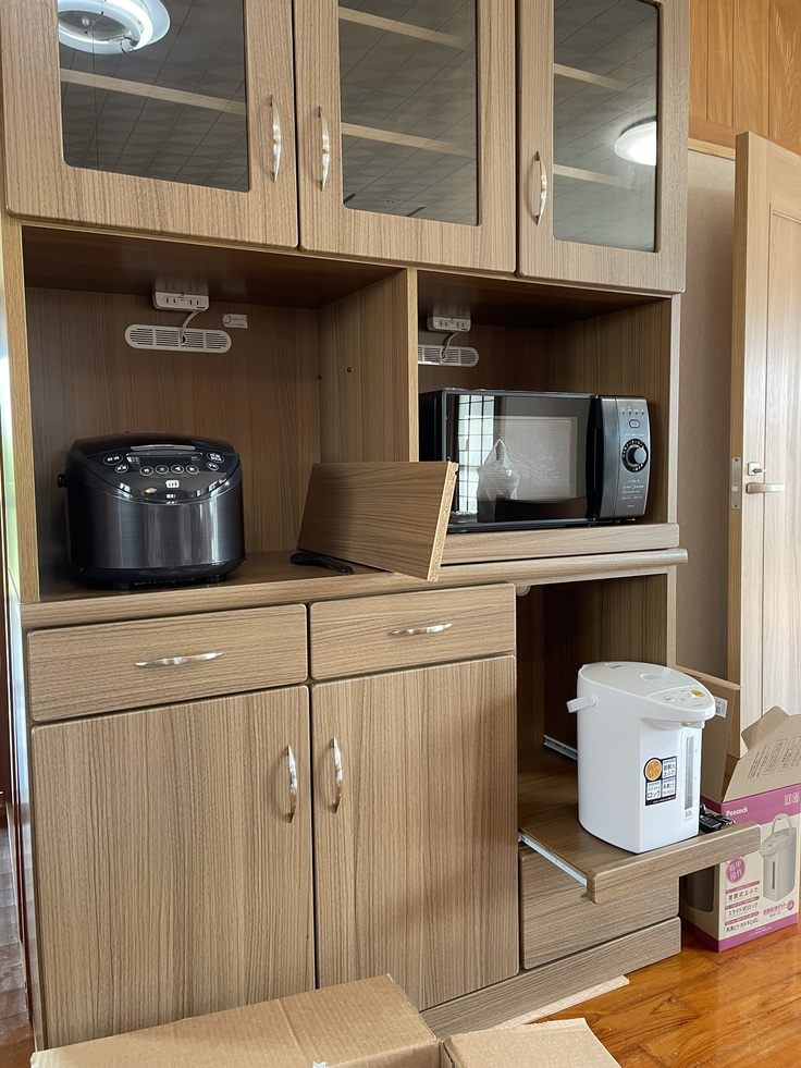 (通常の炊飯器を入れる場所において開くと上のほうに当たるので、一番大きなところにしか収納できませんでした。何か別の方法考えないといけないかもしれません)