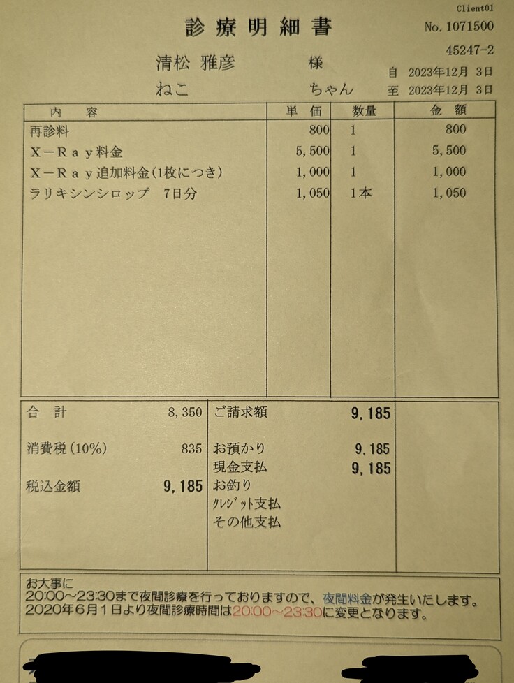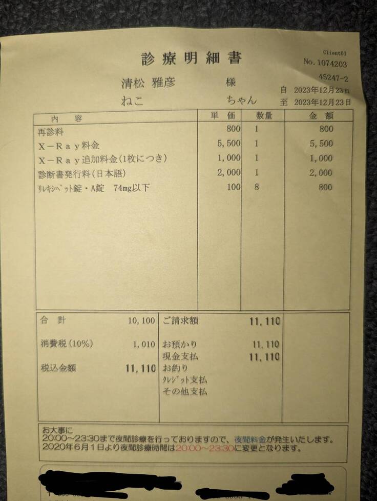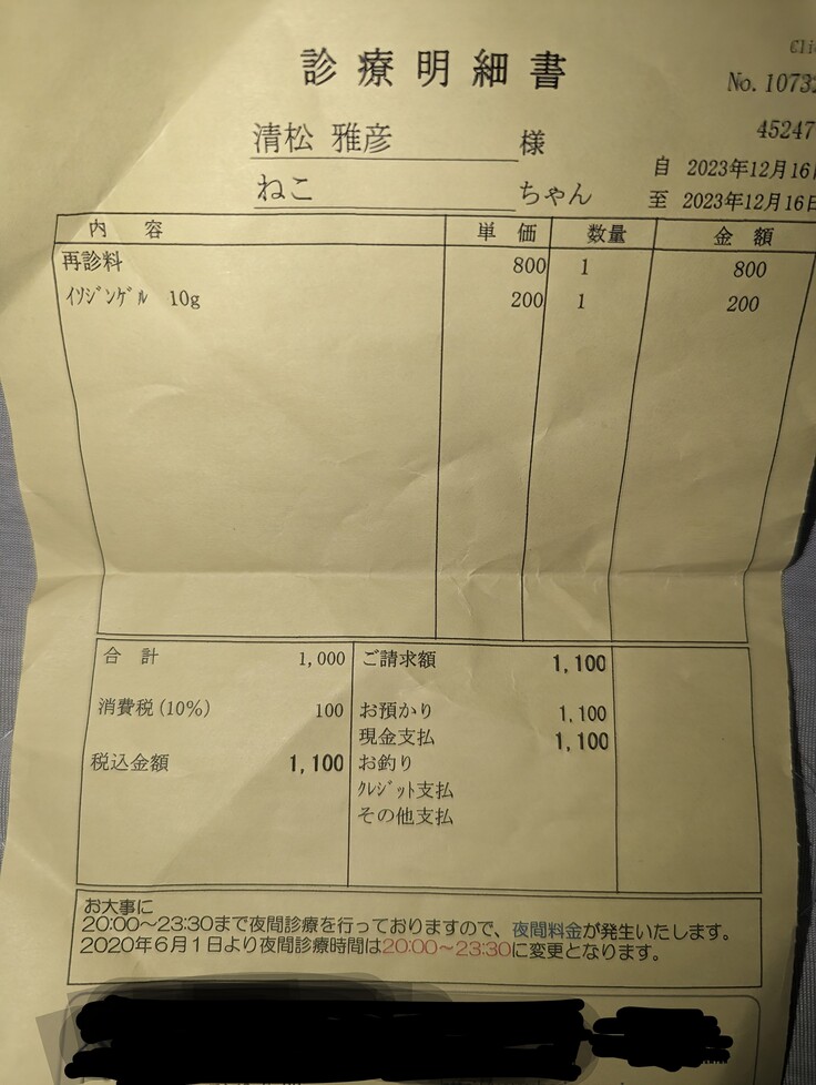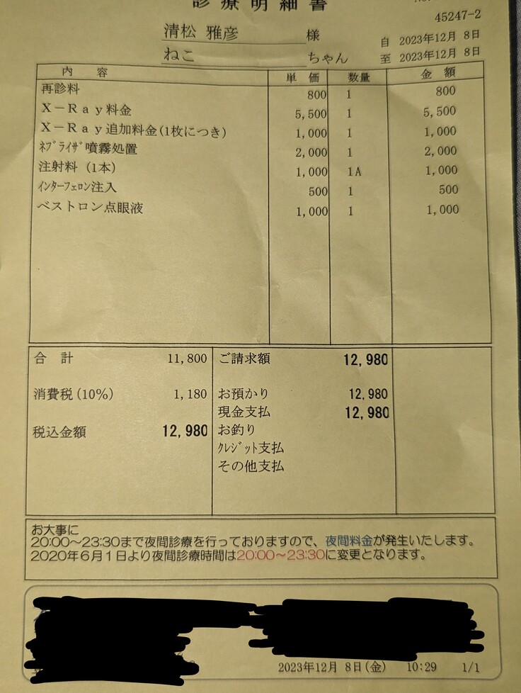 12/13猫風邪治療費=1,650円、12/16猫風邪治療費=1,100円