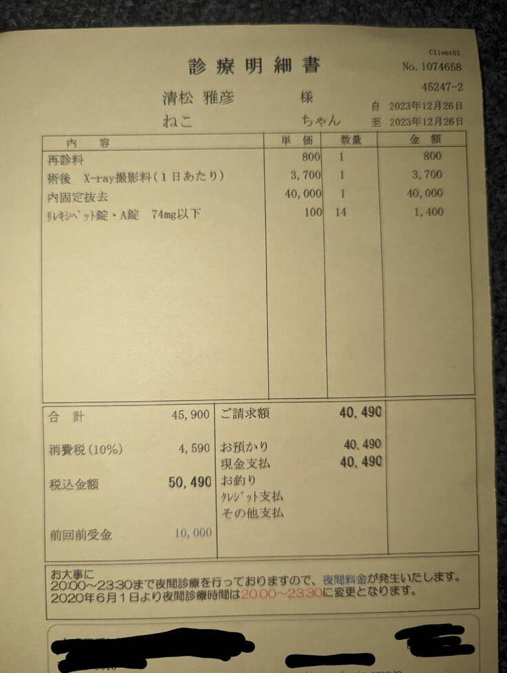 今後支払う費用:レントゲン等の継続治療費等ご協力宜しくお願い致します。