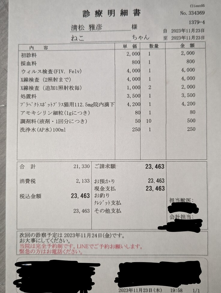 内訳 初診を行った病院→ 11/23初診費用、検査費用=23,463円