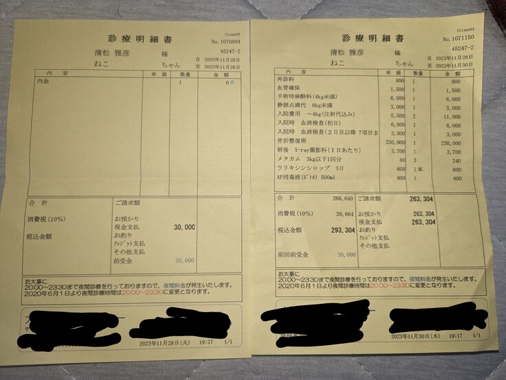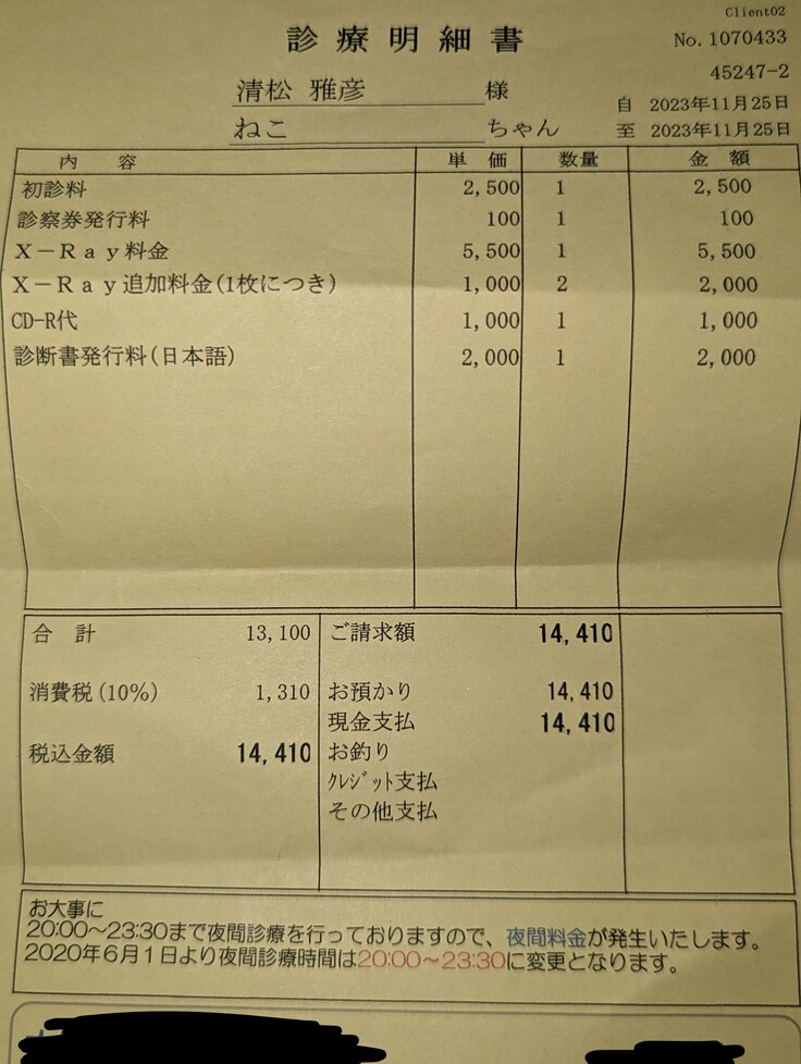 骨折手術の為紹介いただいた病院→11/25初診料、レントゲン、診断書発行代=14,410円