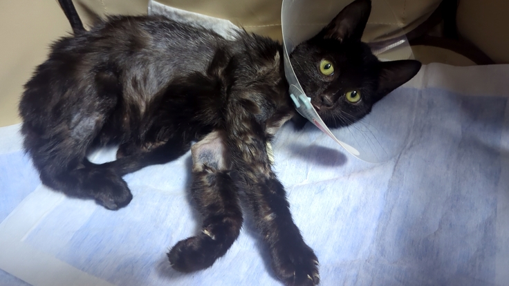 手術後2週間たちました。とりもちの影響ではげた毛はなかなか目立ちますが、ご飯もしっかり食べて元気にすくすく育っています!定期的に経過観察で病院通いですが、おとなしくついてきてくれます!