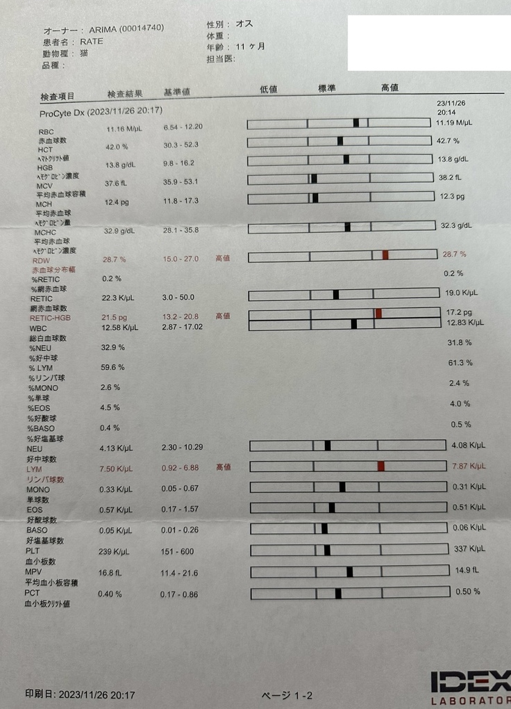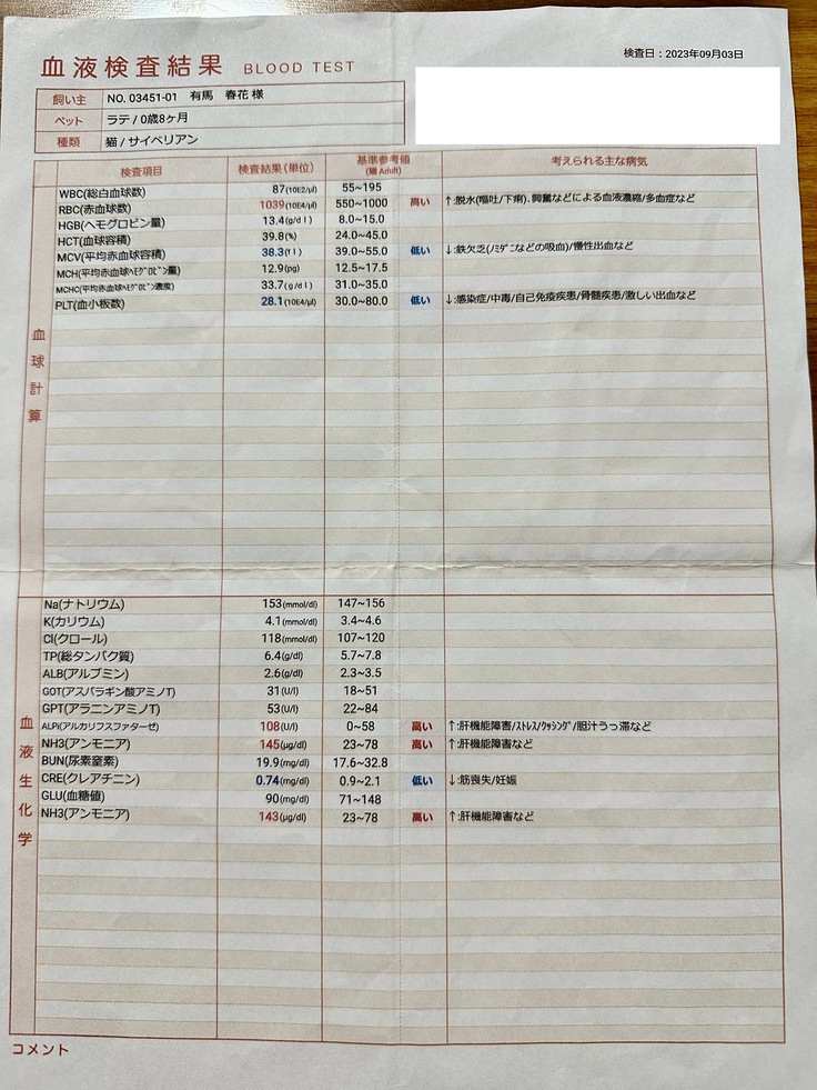 8ヶ月過ぎてから去勢手術の為、血液検査をするとアンモニア数値が高く、ラテは停留睾丸の為、開腹手術を行わないといけないので麻酔をかけれないと言われ去勢は中断し数値を下げる薬を服用。