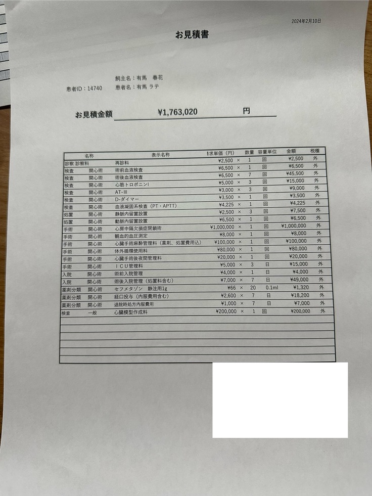 いただいた支援金はラテの手術費用176万円に使用させていただきます。
