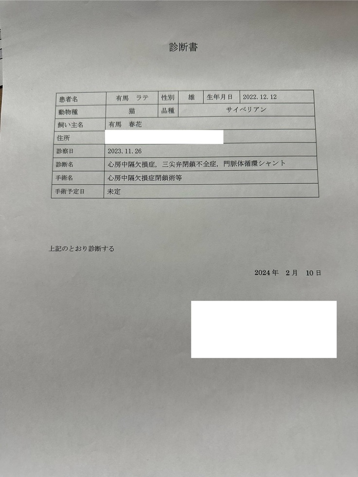 ラテは心房中隔欠損症と門脈体循環シャントがあり両方の手術を行わないといけないです。