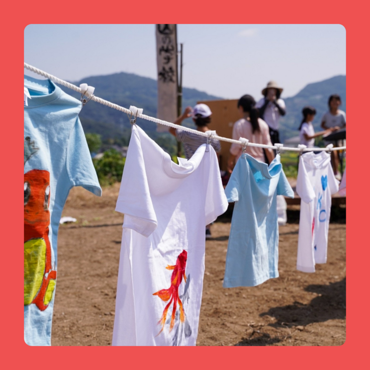 「さが山の学校」で子供達が好きな絵を描いたTシャツを100枚展示しています。