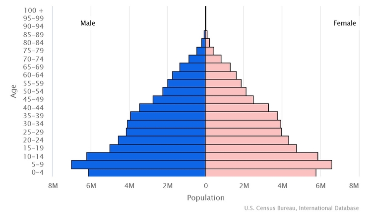 また、若者の失業率は25%と言われています。 その状況で、人口は、1億人を突破、 0-14歳の未就学児の人口は全体の34.37%に及び、これから、ますます若年層の失業が増加する見込みです。