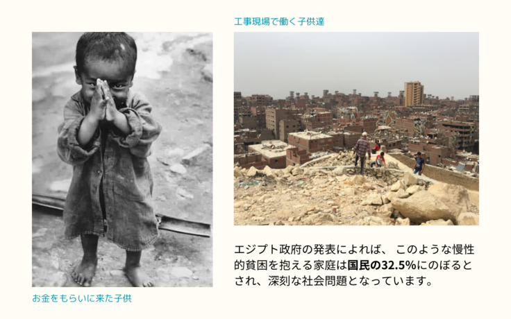 旅のご縁でエジプトへ。そこは全く文化の異なる国でした。 1 ヶ月以上、滞在してもまだ慣れないのは、日々街中で見かける物乞いの人達。そして「プリーズ マネー」とだけで、繰り返し話しかけてくる子供達です。 どの子も幼児から小学生ぐらいで、 ただ遊んでいたい年齢の子供たちです。 彼らは、当たり前のように学校にもいかず、 物乞いや仕事をしなければ生活できないのです。最初は、物乞いしてくる人たちに、深く考えもせず、避けるように接していました。今は、1ヶ月以上の滞在を通して、エジプト人の優しさに触れ、クラウドファンディングをするまでに気持ちが変化しました。