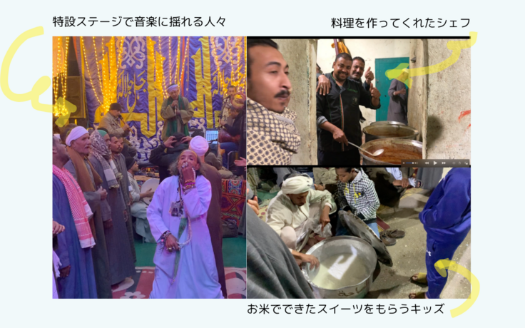メンバーのHanyはルクソール出身、そしてストリートチルドレンとして生活していた過去を持ちます。そんな彼の生まれ故郷で、2023年1月大規模な配給イベントを執り行いました。このイベントでは、滅多にお肉を食べることができない貧困家庭の人々に向けて、大量のお肉料理を用意。加えて、お米と砂糖からできたエジプトのスイーツにみかん、ゆったりとした気持ちになれるお香、そして伝統的な音楽をみんなで共有しました。