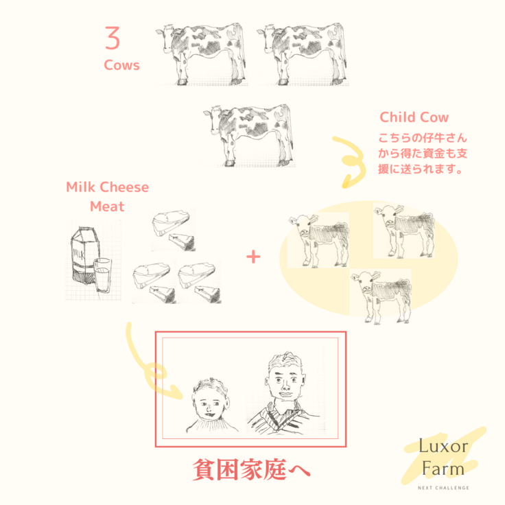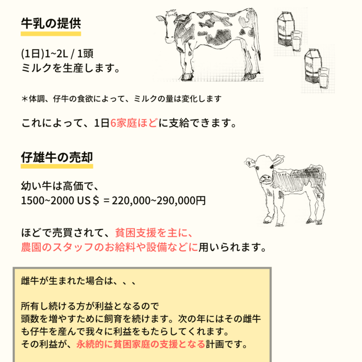 支援いただいた金額239万円(手数料、リターン仕入れ代を除く)から、牛を3匹購入。その牛が生み出した牛乳やチーズを”毎日”支援家庭へ配送致します。この金額には「牛の6ヶ月分+仔牛が生まれた後9ヶ月分の食料」が含まれていて、育った仔牛を売って資金源を獲得したり、農園に育つ牛を増やしたりすることで、"継続した"運営と支援を行っていく予定です。それに加えて、定期的な(年に2回ほど)食料や資金での援助を実施致します。