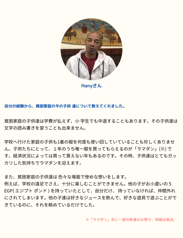 貧困に悩む人達の気持ち、子供達の様子がありありと伝わってきました。 Hany さんは最後に、こう付け足しました。
