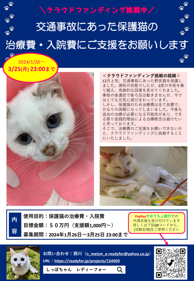 交通事故にあった野良猫「ミケコちゃん」の治療費をご支援ください