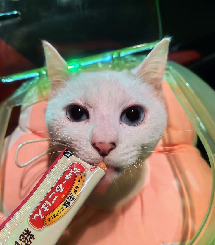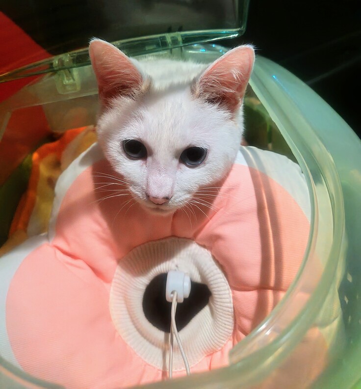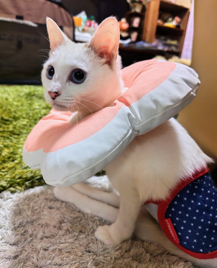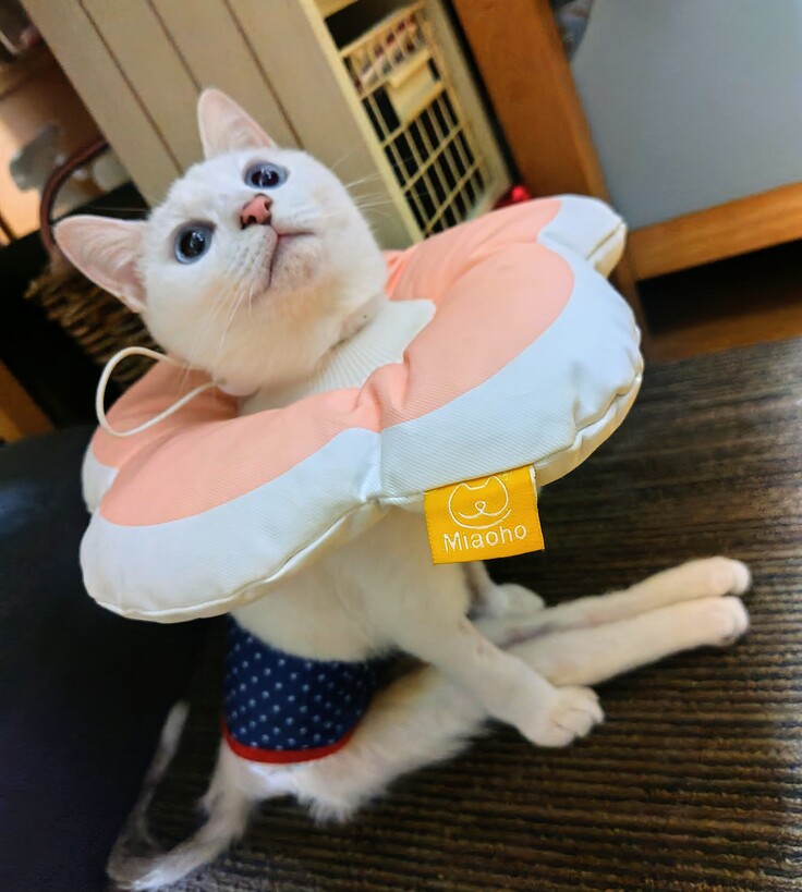 ちゅーるタイムの時に、エリザベス外しちゃダメだよって約束したのに、家に着いた時にはこんな感じに…😂狭いのは自分のせいです〜〜