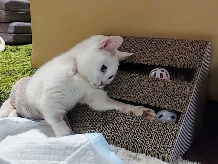 ▼音のなるボールが入った爪とぎ。今はもうバリバリにされて、ボールも飛び出してしまいました…。新調しようと思ったら、もう売ってなかった…🥺