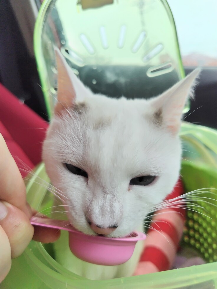車の中で食べるのに゙いいかなと思って買った「にゃんSpoon」、気に入っていただけたようで食い付き🙆♀でした😊
