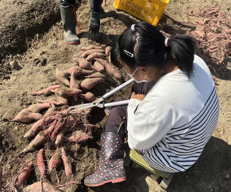 10月に入るとやっと収穫が始まります。つるを切ってマルチをはがすと収穫スタートです。収穫したさつま芋はコンテナに集め、つるを切りひげを取り土を落とします。一つずつひげをピンセットで抜いていきます。
