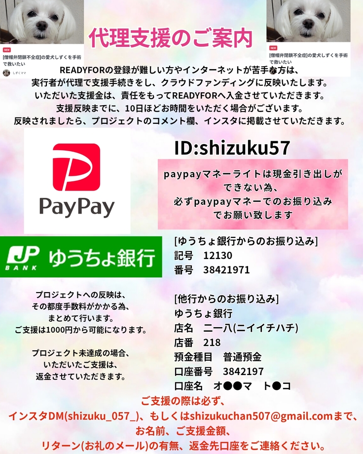 いただいた支援金は、しずくの手術費用に使わせていただきます。