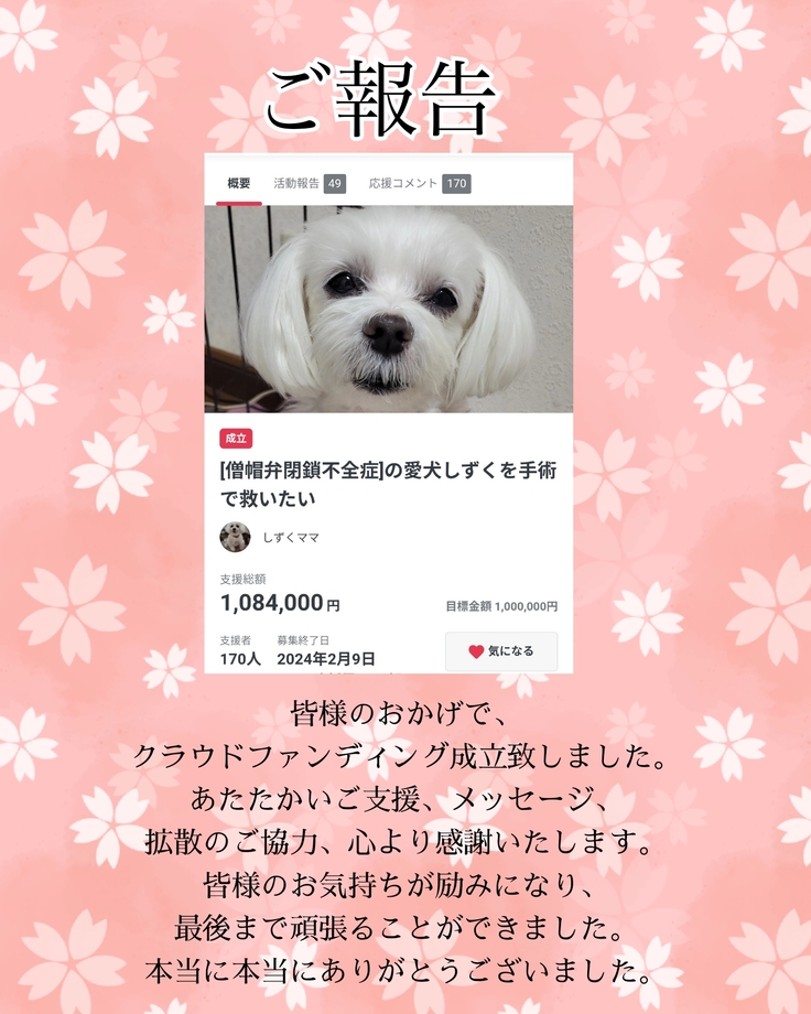 いただいた支援金は、しずくの手術費用に使わせていただきます。
