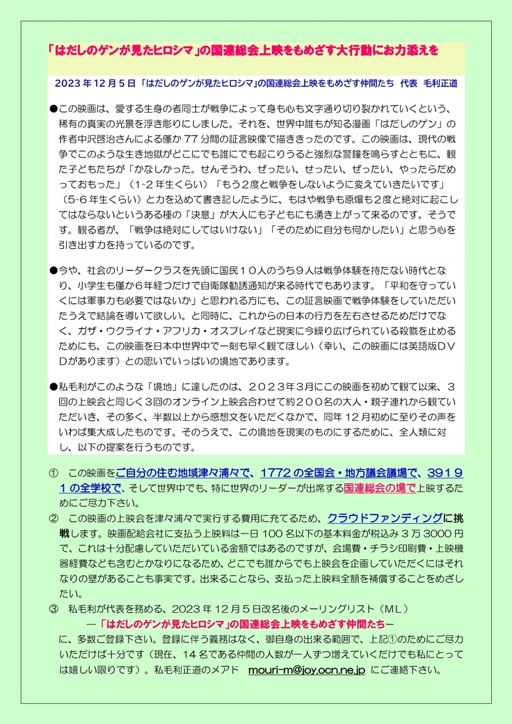 - 毛利正道 「はだしのゲンが見たヒロシマ」の国連総会上映をもめざす仲間たちの代表