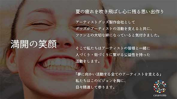 私たちは、アーティストとファンとの絆を強め、業界を盛り上げることで全ての人に笑顔になってもらうことが使命だと思っています。