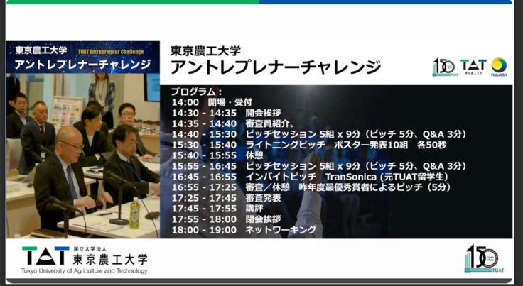 こちらのイベントは、テクノロジーシーズをもとに独創的な発想で社会課題を解決するビジネスプランを提案する起業家や研究者を育成・支援しながら、研究成果の社会実装と学生・教職員の価値創造を促進することを目的として実施されたもの。
