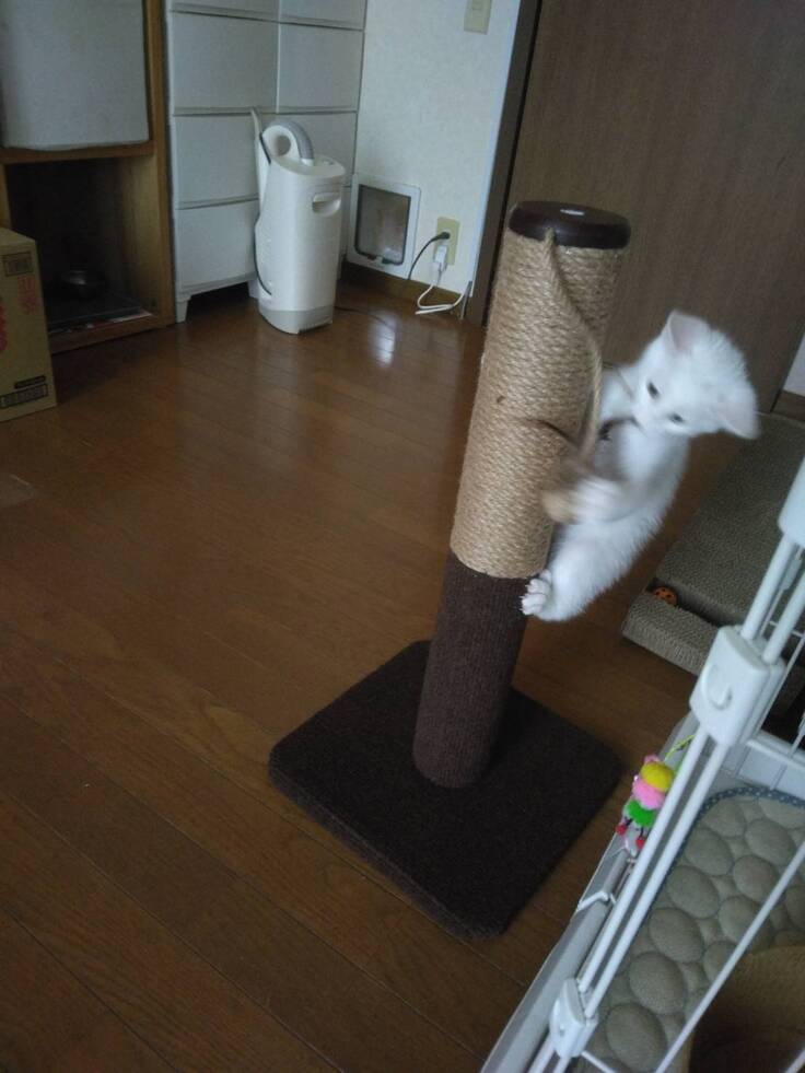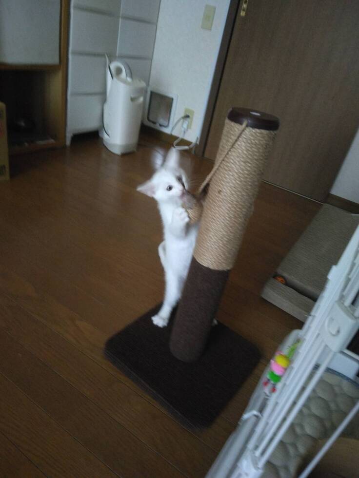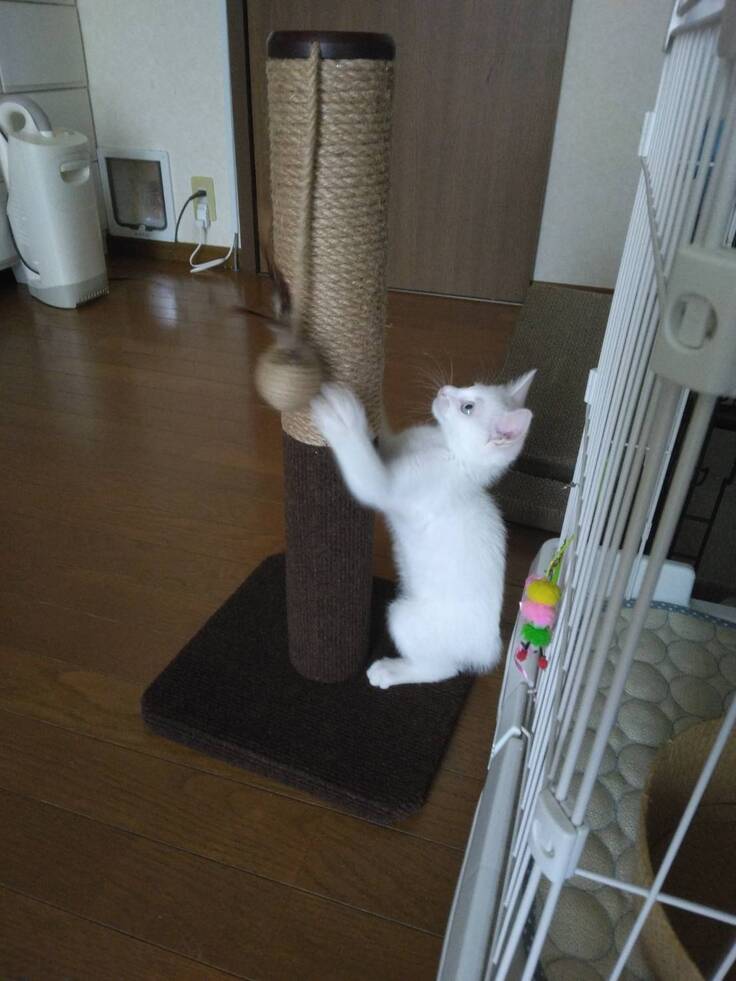 当該のご協力者様のちび白ちゃんにご支援物資の爪研ぎをプレゼントしました。