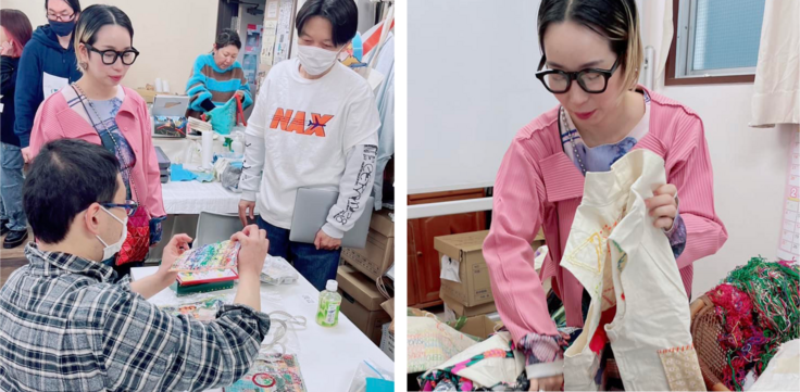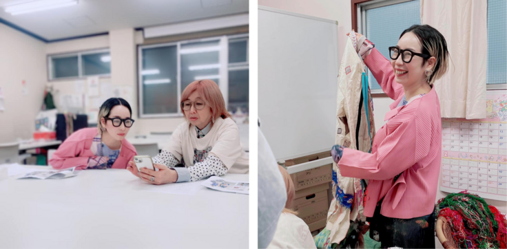 プロのクリエイターさんたちも合流し、今日はスタイリストのヒトミチヒロさん が初来訪、アトリエ内で素材選び。各事業所からピックされた素材を組み合わせてスペシャルな衣装を作っていきます。
