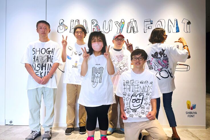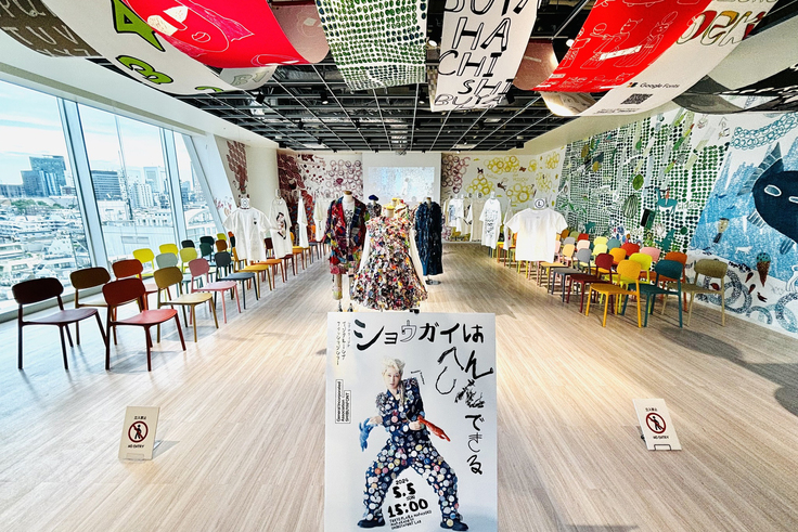 ファッションショーの衣装展示と、カラフルで楽しいデザインのオリジナルグッズの販売を行います。会場ではショーの動画もご覧いただき、当日の雰囲気さながらに展示やショーオリジナルデザインのTシャツ・衣装になったぬいぐるみ<らぶらび>・シブヤフォントデザインの缶バッジ・クッキーなどのお買い物も楽しんでいただけます。