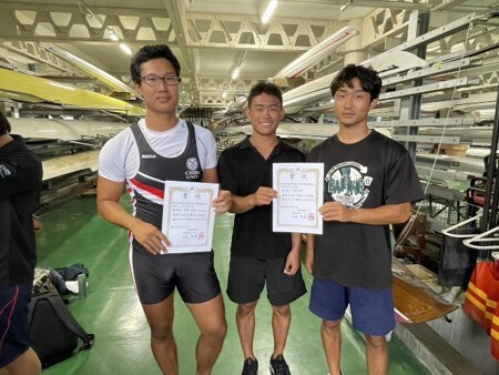 ダブルスカル(S磯田副主将・B相馬)2位入賞 表彰状を掲げた漕手たち