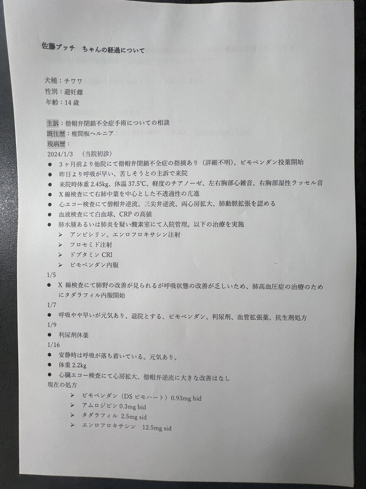 ◆病名僧帽弁閉鎖不全症 ステージC(一度肺水腫で入院しているため)