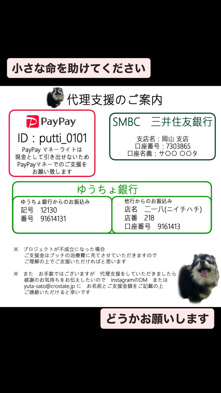送金いただきました支援金は、責任を持って、READYFORへ代行して入金させていただきます。READYFORへの反映は、一週間ほどのお時間をいただいております。READYFORへ反映された際には、プロジェクトのコメント欄に掲載させていただきます。※プロジェクトが達成出来ず不成立となってしまった場合、いただいたご支援金はプッチの治療費に充てさせていただきますので、ご理解いただいた上でご支援いただければ幸いです。プッチに手術を受けさせてあげたいので、どうかご支援、ご協力をよろしくお願いいたします。