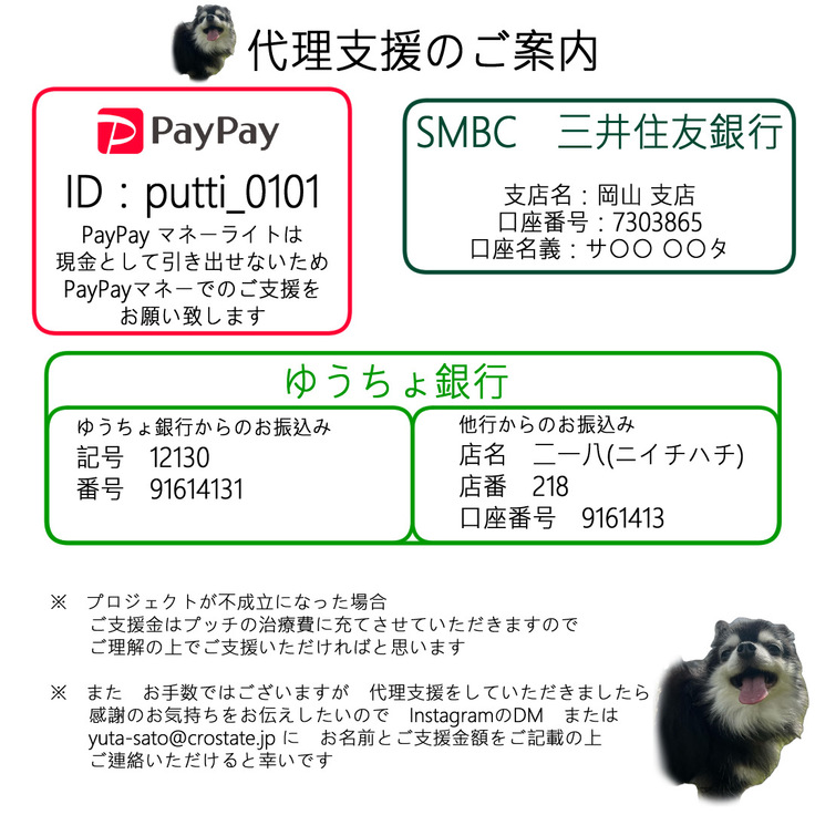 プッチの治療費に充てさせていただきますので、ご理解いただいた上でご支援いただければ幸いです。プッチに手術を受けさせてあげたいので、どうかご支援、ご協力をよろしくお願いいたします!