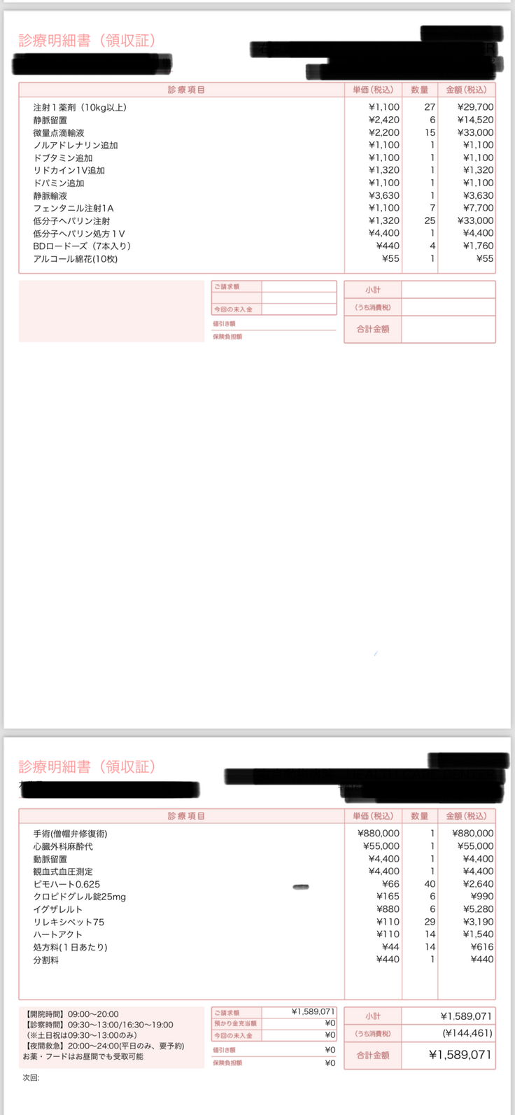 手術予定病院からいただいてる見積書になります。最低この金額で入院日数などが伸びるとさらに費用がかかります。手術後は術後検査が数回あり別途費用と遠方のため交通費もかなりかかってしまいます💦