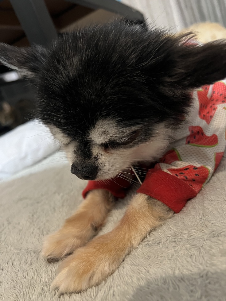 プッチは現在ほとんど寝て過ごしています。ご飯の食べる量も減ってきています。苦しそうな仕草などはないのですが起きあがろうとしても立てない時があります。