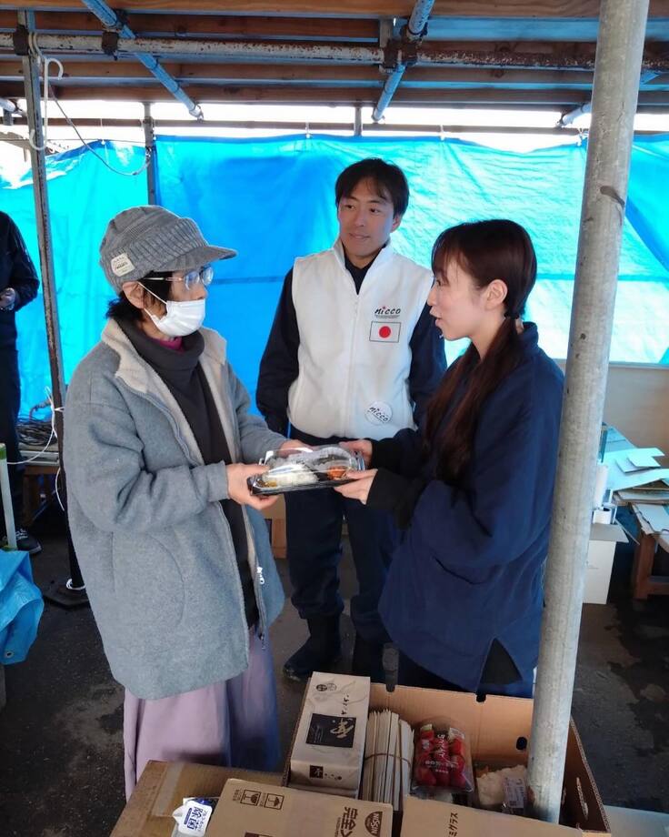 1月19日、輪島市町野町および小伊勢町にて、お弁当と物資を配布しました。