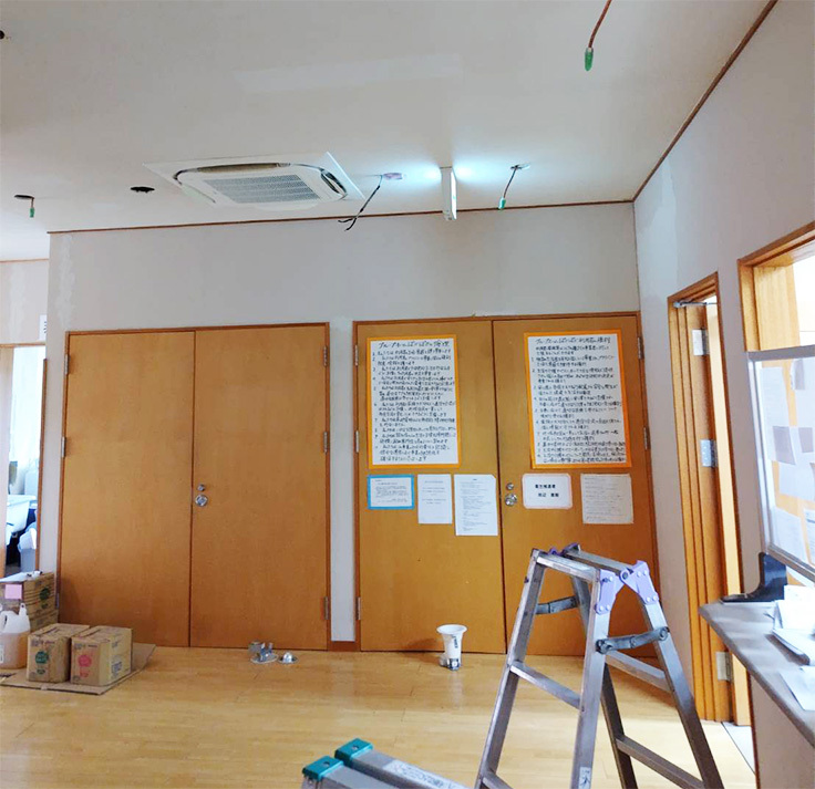 地震発生後、故障したままで手つかずだったグループホームぽかぽかの火災報知器と照明の修理に来ていただくことができました。3月に入り、ここ能登町でも少しづつ電気や水回り、設備関係の修理屋さんが地元をまわりながら修繕箇所の確認や初期の修理を始めてくれていると聞きます。