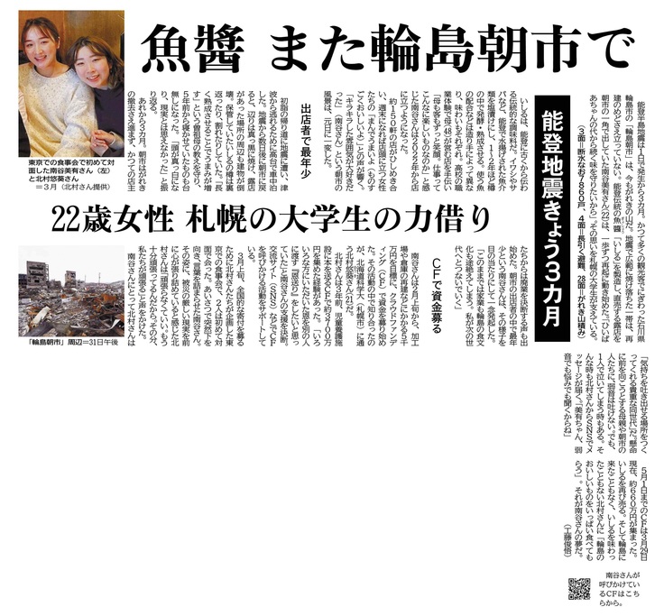 4月1日、北村 悠葵ちゃんの尽力のおかげで北海道新聞の一面に掲載して頂きました!!!!