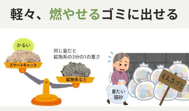 猫砂のゴミ出しの扱いに悩んでいませんか? 猫砂の種類によって、地域ごとに分別方法が違ったり、そもそも出せなかったり。100%植物生まれの猫砂は当然「燃やせるゴミ」です!水分を吸って重たくなった猫砂をゴミで出すのは、気持ち的にも後ろめたさが残ります。かる~い猫砂なら、気持ちも持ち運びも軽々。気持ちよくゴミ出しできます!