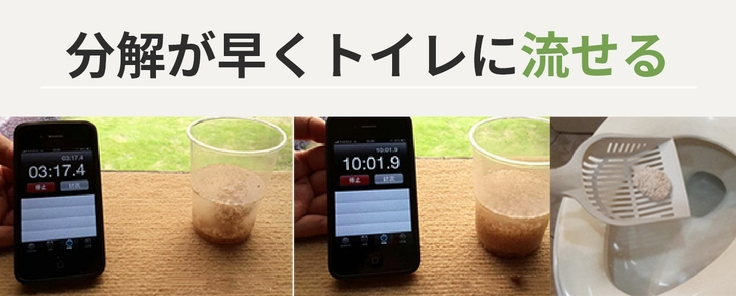吸水が早いので、水の中に入ると約3分間で分解されます。10分経つと、おかゆ状になり、トイレに流すことができます。ウンチだけでもトイレに流せると助かりますよね。スマートキャットなら便に砂が付いていても気軽に流すことができます。