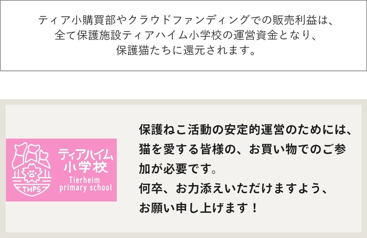 ※現在、他社でもクラウドファンディングを実施中ですが、そちらは切迫した状況での緊急支援として運営費を募っております。一方、本プロジェクトはティアハイム小学校購買部の通常販売の延長として、スマートキャットを気に入っていただけた方が定期的に購買部でご購入いただけるきっかけを作り、日々のお買い物でティアハイム小学校の運営をご支援いただくためのプロジェクトとなっております。同じ保護猫施設の運営費としてのご支援ですが、役割が異なりますことをご了承いただけましたら幸いです。