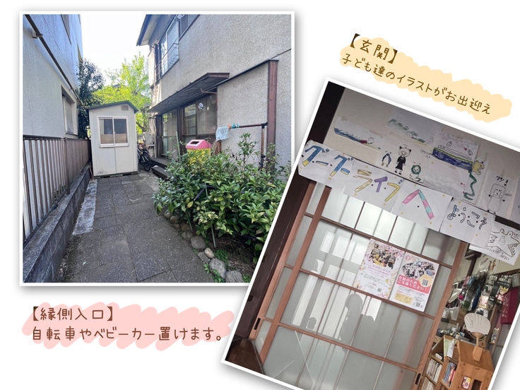 →スタッフが玄関までお出迎えします。入口は正面と、建物向かって左手の縁側の2箇所です。(慣れている方は縁側口からどうぞ^^)
