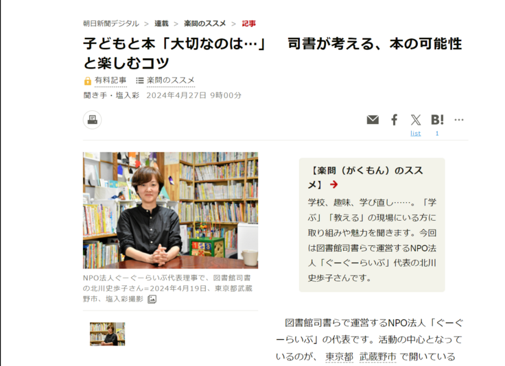 先日4/27(土)、朝日新聞の朝刊にぐーぐーらいぶ代表理事 北川のインタビュー記事が掲載されました!