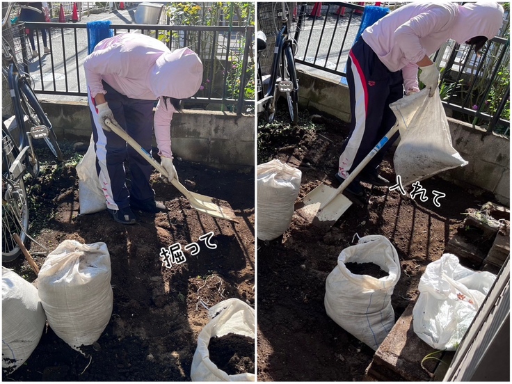 この日は庭の整備と物販スペースとなる一階の床塗りをメインに作業。土が豊富なお庭、以前は野菜なども育てていたようでミミズや芋虫もたくさんいました。そんな栄養満点な庭を平地にすべく、スコップで土をかいては袋へ入れ、かいては入れ...