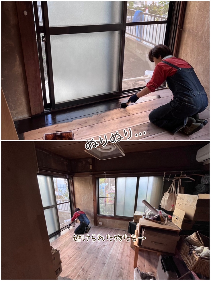 昼前には太陽サンサンだったので、一旦室内へ避難...お昼休憩を挟み昼過ぎからは床をぬりぬり。棚や段ボールを避けてたり、他の部屋に移動したりしながらなんとかスペースを確保して塗装開始。