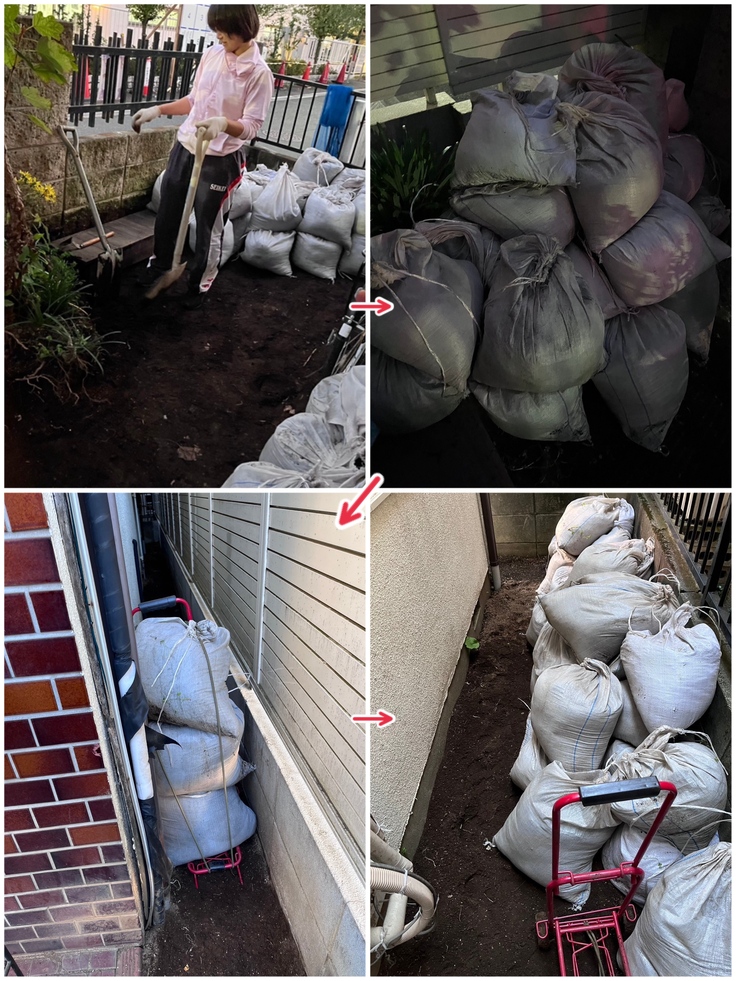 大量の土嚢袋は、後日代表のしほこさんが活動の合間に何日かに分けて1人で裏手に運搬したそうです...(オツカレサマデシタ😭) いつも使っている赤い荷物カートが通路幅にシンデレラフィット✨