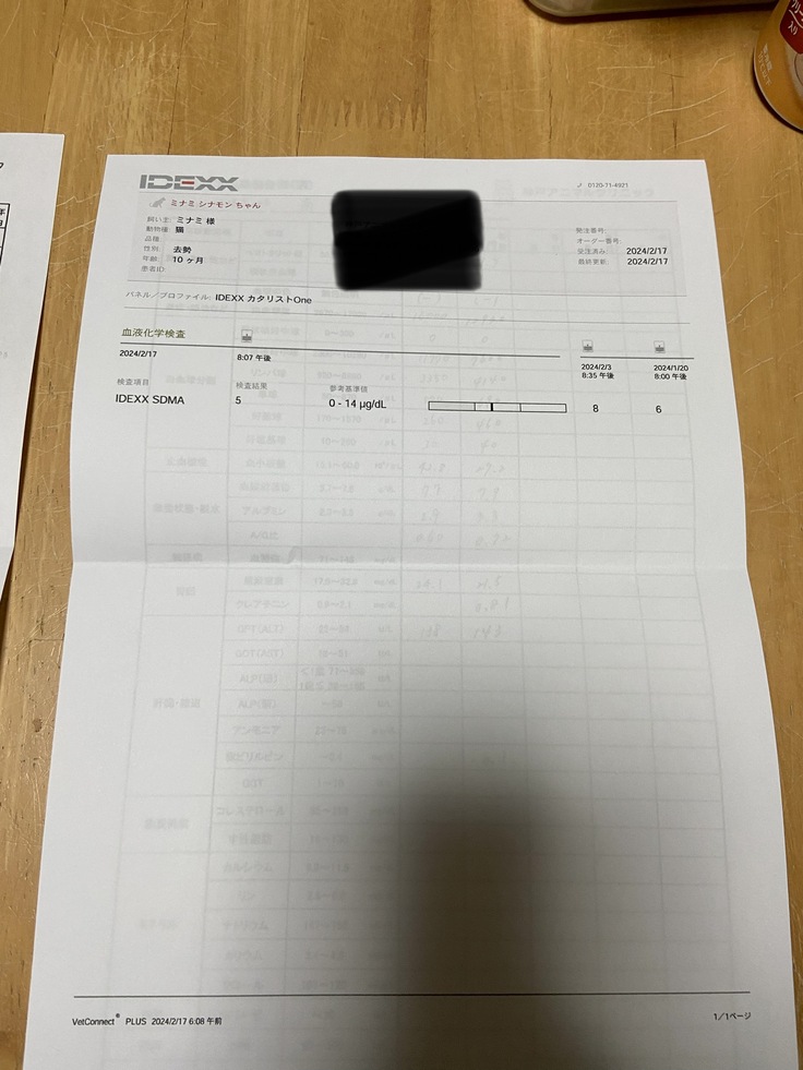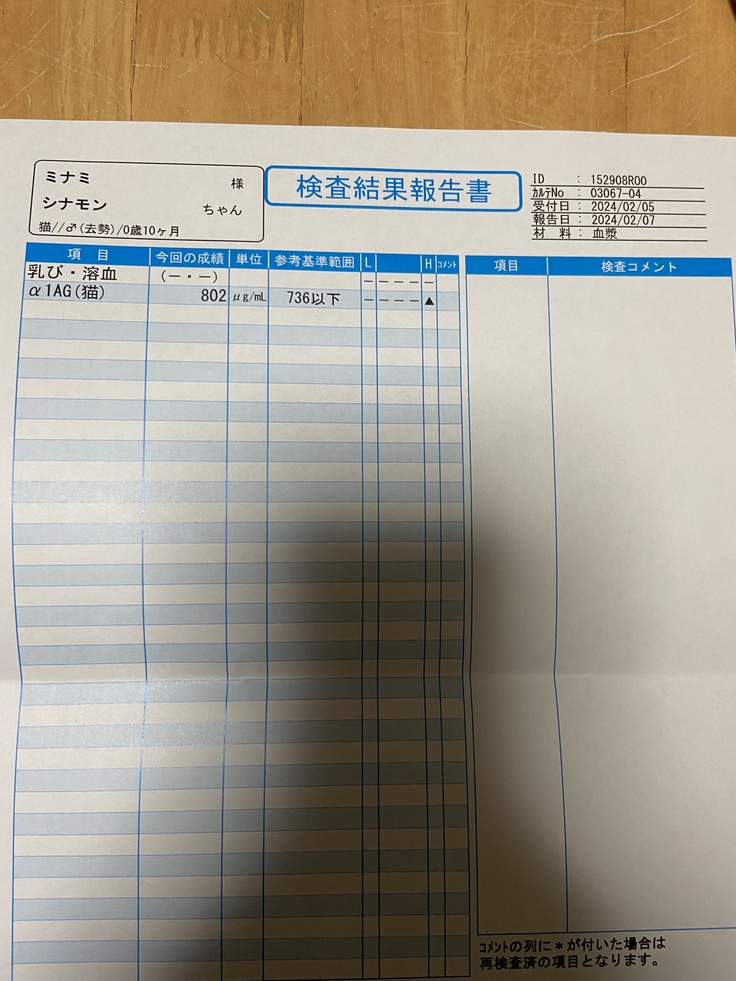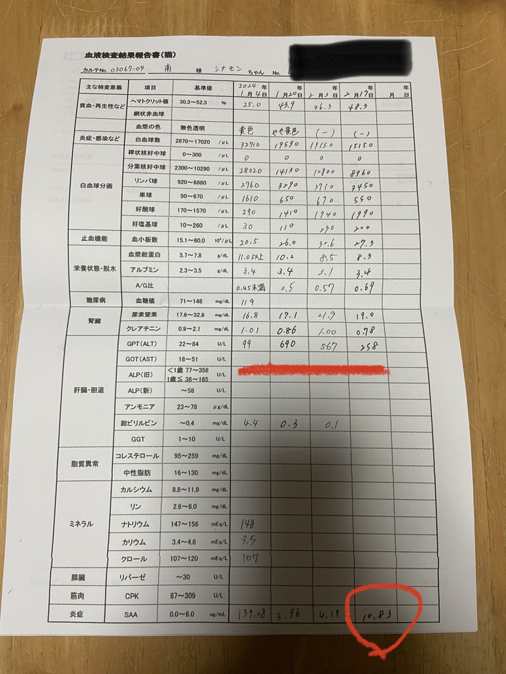 シナモンの検査の結果は、だいたいが上向き傾向ですが、前回悪かった肝臓の数値も大きく改善は認められるけれど、まだ基準値外。